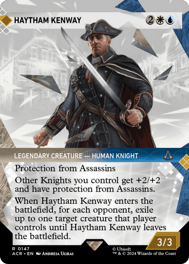 Protection from Assassins Other Knights you control get +2/+2 and have protection from Assassins. When Haytham Kenway enters, for each opponent, exile up to one target creature that player controls until Haytham Kenway leaves the battlefield.