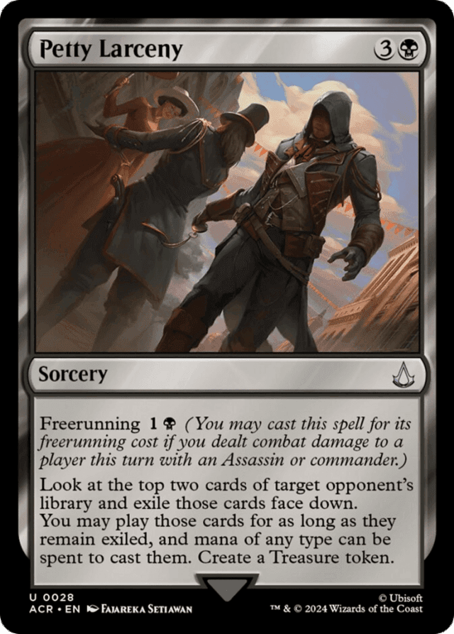 Freerunning {1}{B} (You may cast this spell for its freerunning cost if you dealt combat damage to a player this turn with an Assassin or commander.) Look at the top two cards of target opponent's library and exile those cards face down. You may play those cards for as long as they remain exiled, and mana of any type can be spent to cast them. Create a Treasure token.