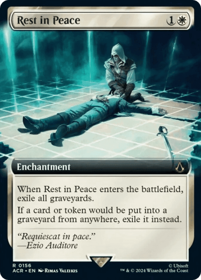 If Rest in Peace is destroyed by a spell, Rest in Peace will be exiled and then the spell will be put into its owner's graveyard. — If a card is discarded while Rest in Peace is on the battlefield, abilities that function when a card is discarded (such as madness) still work, even though that card never reaches a graveyard. In addition, spells or abilities that check the characteristics of a discarded card (such as Chandra Ablaze's first ability) can find that card in exile. — While Rest in Peace is on the battlefield, abilities that trigger whenever a creature dies won't trigger because cards and tokens are never put into a player's graveyard.