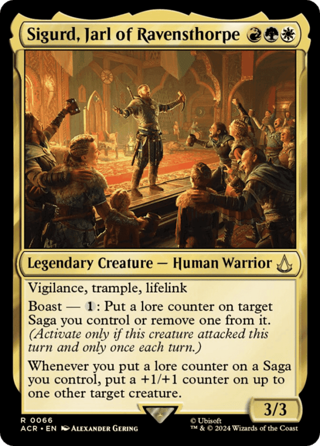Vigilance, trample, lifelink Boast — {1}: Put a lore counter on target Saga you control or remove one from it. (Activate only if this creature attacked this turn and only once each turn.) Whenever you put a lore counter on a Saga you control, put a +1/+1 counter on up to one other target creature.