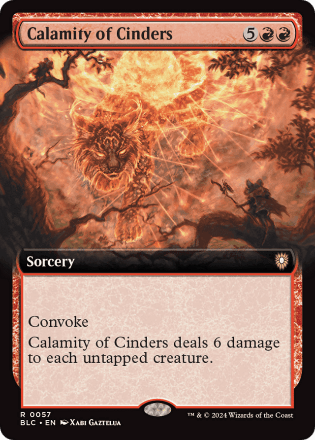 Convoke (Your creatures can help cast this spell. Each creature you tap while casting this spell pays for {1} or one mana of that creature's color.) Calamity of Cinders deals 6 damage to each untapped creature.