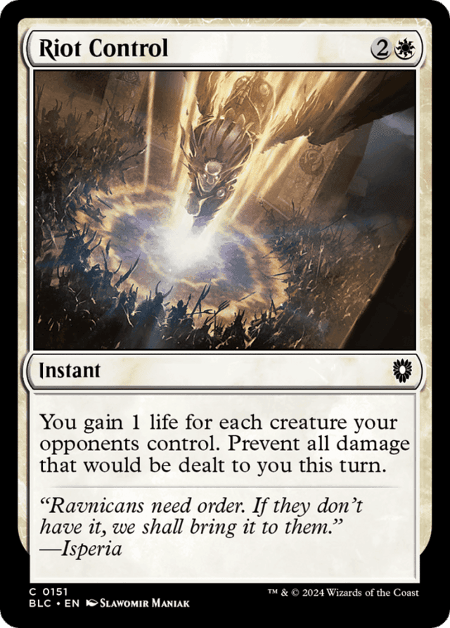 Count the number of creatures your opponents control as Riot Control resolves to determine how much life you gain. — Riot Control doesn't prevent combat damage that would be dealt to planeswalkers you control. It also doesn't prevent damage that would be dealt to creatures you control.