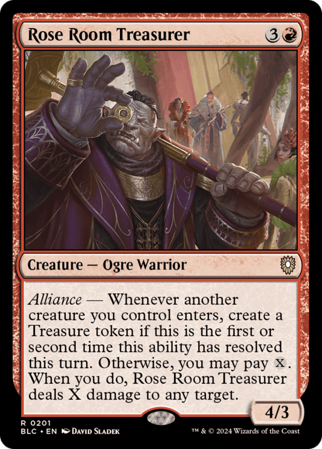 Alliance — Whenever another creature you control enters, create a Treasure token if this is the first or second time this ability has resolved this turn. Otherwise, you may pay {X}. When you do, this creature deals X damage to any target.