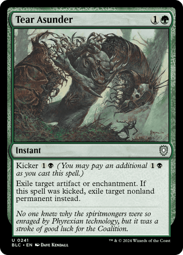 If Tear Asunder is kicked, it can target any nonland permanent, not just an artifact or enchantment. — If a card or token enters as a copy of a permanent, the new permanent isn't kicked, even if the original was. — If a spell's kicker cost was paid, the spell is "kicked." — If you copy a kicked spell on the stack, the copy is also kicked. If the copied spell is a permanent spell, the token the copy of that spell becomes when it enters is also kicked. — If you put a permanent with a kicker ability onto the battlefield without casting it, you can't kick it. — The kicker ability doesn't let you pay a kicker cost more than once. — To determine a spell's total cost, start with the mana cost (or an alternative cost if another card's effect allows you to pay one instead), add any cost increases (such as kicker), then apply any cost reductions. The spell's mana value remains unchanged, no matter what the total cost to cast it was.