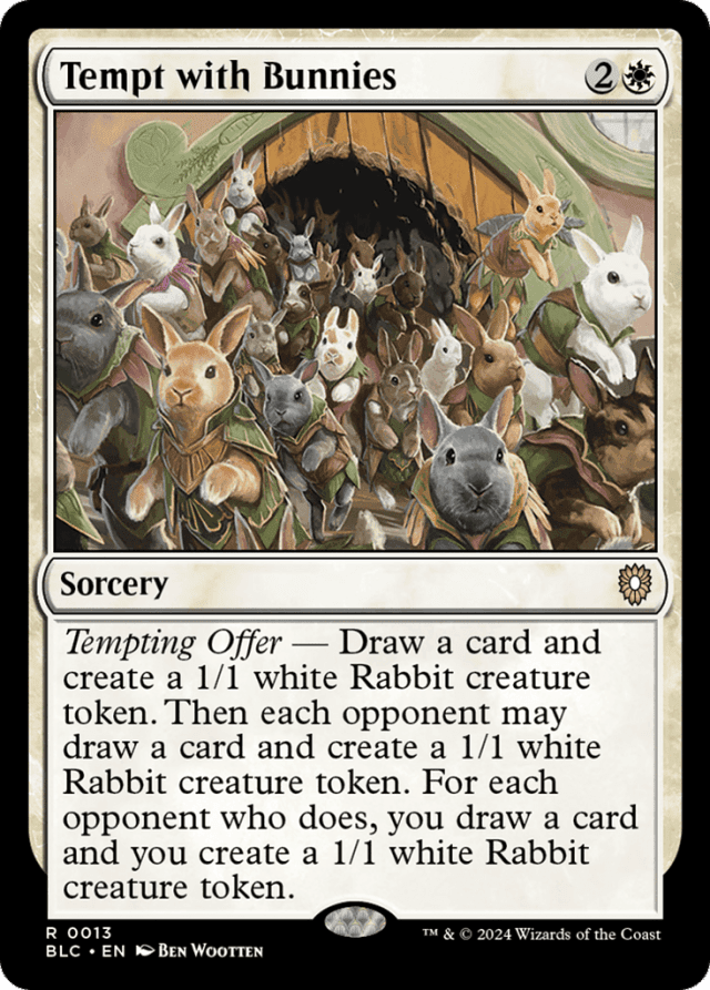 Tempting Offer — Draw a card and create a 1/1 white Rabbit creature token. Then each opponent may draw a card and create a 1/1 white Rabbit creature token. For each opponent who does, you draw a card and you create a 1/1 white Rabbit creature token.