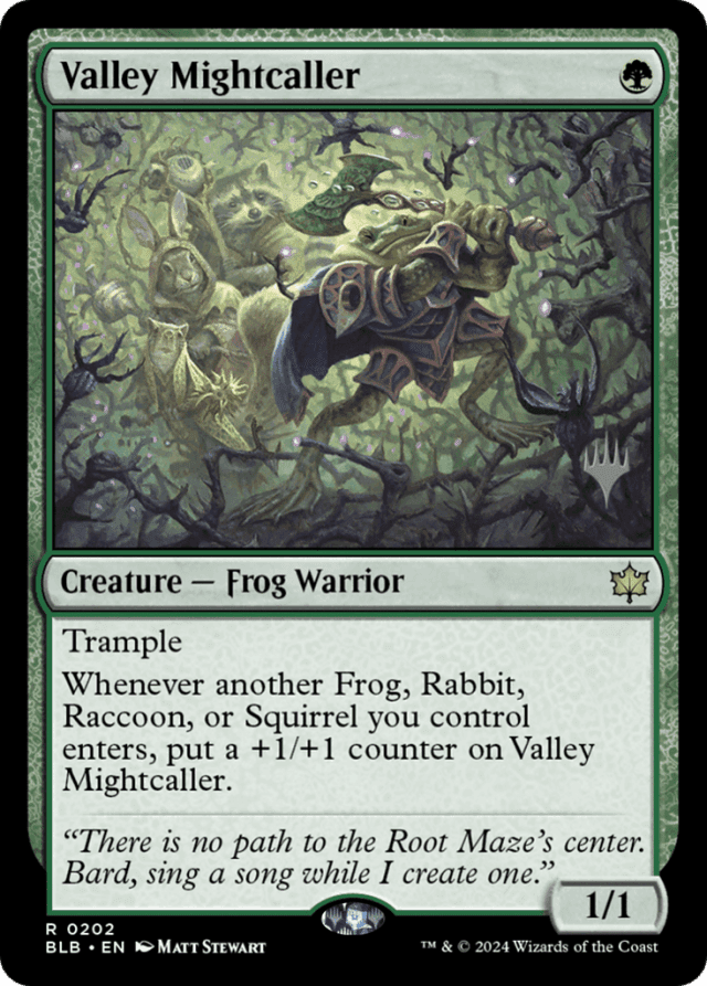 If Valley Mightcaller enters at the same time as one or more other Frogs, Rabbits, Raccoons, or Squirrels you control, its second ability will trigger for each of them.