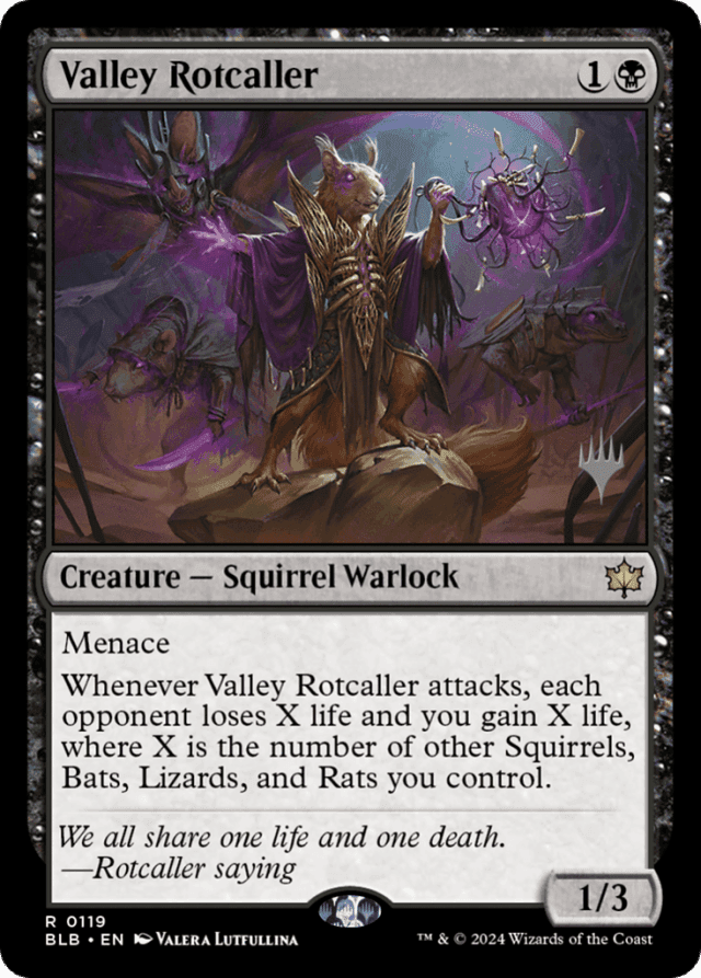 Menace Whenever this creature attacks, each opponent loses X life and you gain X life, where X is the number of other Squirrels, Bats, Lizards, and Rats you control.