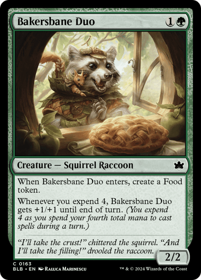 A permanent with an ability that triggers whenever you "expend N" will see mana you spent to cast spells the turn it enters, including mana you spent before it entered. For example, if you cast Junkblade Bruiser (a creature with a mana value of 5 and an ability that triggers whenever you expend 4) by paying its full cost of five mana, you'll already have spent four mana on spells before Junkblade Bruiser enters, and therefore its ability that triggers whenever you expend 4 won't be able to trigger at all that turn. — Abilities that trigger whenever you "expend N" only trigger when you reach that specific amount of mana spent on casting spells that turn. This can only happen once per turn. For example, if you've spent three mana on spells so far this turn and you control a permanent with an ability that triggers "whenever you expend 4," that ability will trigger the next time you spend at least one mana to cast a spell this turn. It won't trigger again if you spend another four mana to cast spells later in the turn. — If the cost to cast a spell is increased, decreased, or changed because of additional or alternative costs, expend counts only the mana you actually spent. — Food is an artifact type. Even though it appears on some creatures, it's never a creature type. — Whatever you do, don't eat the delicious cards. — You can't sacrifice a Food to pay multiple costs. For example, you can't sacrifice a Food token to activate its own ability and also to activate Maraleaf Rider's ability.