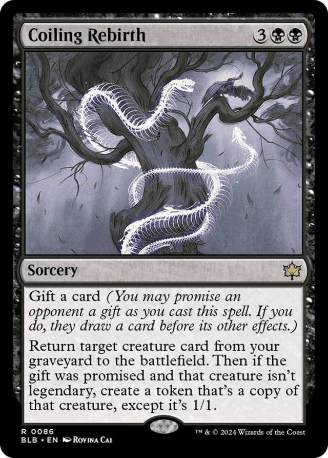 Any abilities that trigger during the resolution of Coiling Rebirth will wait to be put onto the stack until Coiling Rebirth finishes resolving. An ability that triggers when the creature is returned to the battlefield from the graveyard may target the token copy, and vice versa. — Any “enters” abilities of the copied creature will trigger when the token enters. Any “as [this creature] enters” or “[this creature] enters with” abilities of the copied creature will also work. — As an additional cost to cast a spell with gift, you can promise the listed gift to an opponent. That opponent is chosen as part of that additional cost. The gift isn’t given at this time; rather, it’s given at a later time based on whether or not the spell is a permanent spell. — For instants and sorceries with gift, the gift is given to the appropriate opponent as part of the resolution of the spell. This happens before any of the spell’s other effects would take place. — For permanent spells with gift, an ability triggers when that permanent enters if the gift was promised. When that ability resolves, the gift is given to the appropriate opponent. — If a spell for which the gift was promised is countered, doesn’t resolve (perhaps because all of its targets are illegal), or is otherwise removed from the stack, the gift won’t be given. None of its other effects will happen either. — If the copied creature has {X} in its mana cost, X is 0. — If you copy a spell for which the gift was promised, the gift was also promised to the same opponent for the copy. If a card or token enters as a copy of a permanent that’s already on the battlefield, the gift isn’t promised for that new permanent, even if it was promised for the original. — In the main set, there are four different kinds of gifts. “Gift a Food” causes the chosen opponent to create a Food token, while “Gift a Treasure” causes the chosen opponent to create a Treasure token. “Gift a card” causes them to draw a card, and “Gift a tapped Fish” causes them to create a tapped 1/1 blue Fish creature token. The Commander decks contain two more kinds of gifts: “Gift an Octopus,” which causes the chosen opponent to create an 8/8 blue Octopus creature token, and “Gift an extra turn,” which causes them to take an extra turn after the current turn ends. — Some instant or sorcery spells require alternative or additional targets if the gift was promised. You ignore these targeting requirements if the gifts aren’t promised for those spells. On the other hand, you can promise a gift for a permanent spell even if you won’t be able to choose targets for an enters ability of that permanent once the spell resolves. — The token created by the additional effect of Coiling Rebirth isn’t “cast,” so abilities that trigger when a creature spell is cast won’t trigger for the copy. — You can’t pay a gift cost more than once.