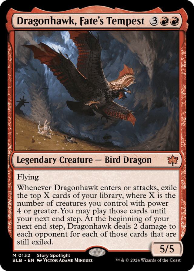 Flying Whenever Dragonhawk enters or attacks, exile the top X cards of your library, where X is the number of creatures you control with power 4 or greater. You may play those cards until your next end step. At the beginning of your next end step, Dragonhawk deals 2 damage to each opponent for each of those cards that are still exiled.