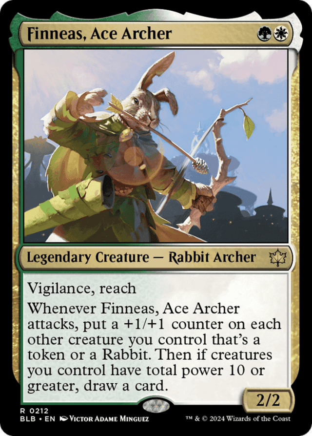Vigilance, reach Whenever Finneas attacks, put a +1/+1 counter on each other creature you control that's a token or a Rabbit. Then if creatures you control have total power 10 or greater, draw a card.