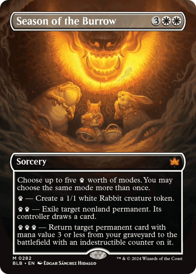 Choose up to five {P} worth of modes. You may choose the same mode more than once. {P} — Create a 1/1 white Rabbit creature token. {P}{P} — Exile target nonland permanent. Its controller draws a card. {P}{P}{P} — Return target permanent card with mana value 3 or less from your graveyard to the battlefield with an indestructible counter on it.