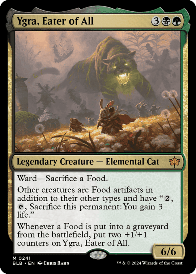 Ward—Sacrifice a Food. Other creatures are Food artifacts in addition to their other types and have "{2}, {T}, Sacrifice this permanent: You gain 3 life." Whenever a Food is put into a graveyard from the battlefield, put two +1/+1 counters on Ygra.