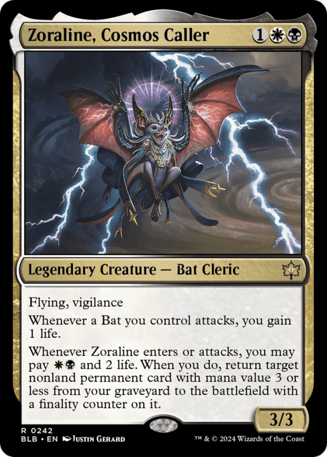 Flying, vigilance Whenever a Bat you control attacks, you gain 1 life. Whenever Zoraline enters or attacks, you may pay {W}{B} and 2 life. When you do, return target nonland permanent card with mana value 3 or less from your graveyard to the battlefield with a finality counter on it.