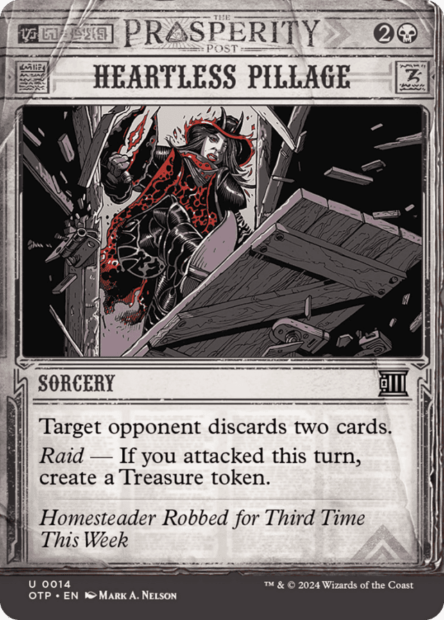 Target opponent discards two cards. Raid — If you attacked this turn, create a Treasure token. (It's an artifact with "{T}, Sacrifice this token: Add one mana of any color.")