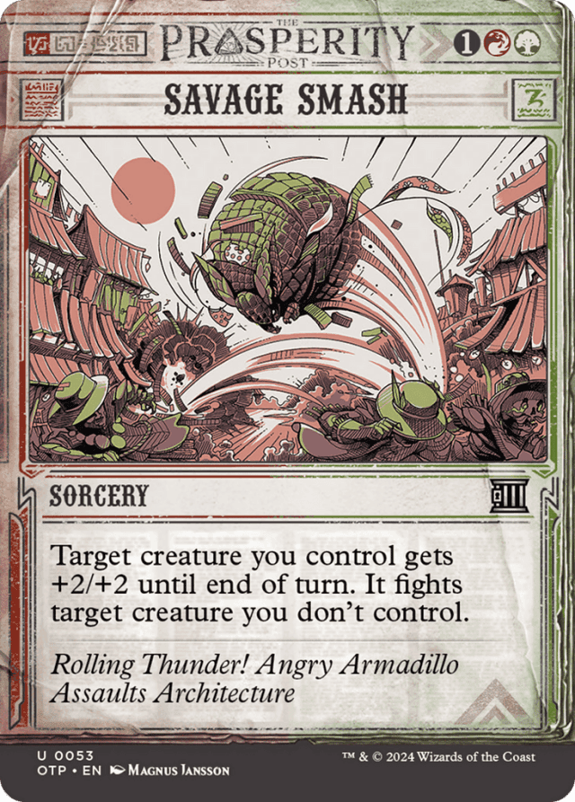 If either target is an illegal target as Savage Smash resolves, neither creature will deal or be dealt damage. — If the creature you control is an illegal target as Savage Smash tries to resolve, it won’t get +2/+2. If that creature is a legal target but the other creature isn’t, the creature you control still gets +2/+2. — You can’t cast Savage Smash unless you choose both a creature you control and a creature you don’t control as targets.