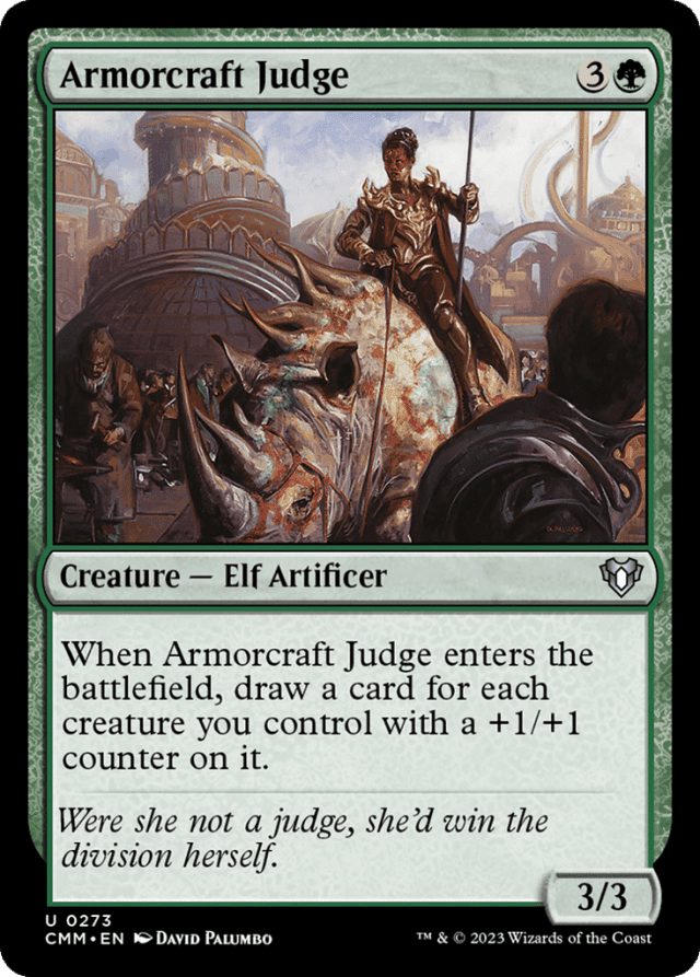 Armorcraft Judge's ability counts the number of creatures, not the number of counters. A creature with more than one +1/+1 counter won't cause you to draw more than one card. — The number of creatures you control with +1/+1 counters on them is counted only as Armorcraft Judge's triggered ability resolves. Players may respond to the triggered ability by trying to change that number.