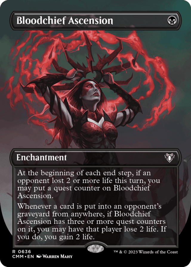 Bloodchief Ascension’s first ability checks how much life was lost by each opponent over the course of the entire turn, even if Bloodchief Ascension wasn’t on the battlefield the whole time. — Bloodchief Ascension’s first ability checks only whether life was lost. It doesn’t care whether life was also gained. For example, if an opponent lost 4 life and gained 6 life during the turn, that player will have a higher life total than they started the turn with — but Bloodchief Ascension’s first ability will still trigger. — Bloodchief Ascension’s first ability has an “intervening ‘if’ clause.” It won’t trigger at all unless an opponent has already lost 2 or more life by the time the end step begins. — Bloodchief Ascension’s second ability doesn’t behave like a leaves-the-battlefield triggered ability, since the card put into an opponent’s graveyard may come from anywhere. If a Bloodchief Ascension with three quest counters on it and a permanent an opponent owns are destroyed at the same time, for example, the game will not “look back in time” at the game state, and Bloodchief Ascension’s second ability won’t trigger. — For the first ability to trigger, a single opponent must have lost 2 life. Two opponents each losing 1 life won’t cause it to trigger. It will trigger a maximum of once per turn, no matter how many opponents have lost 2 or more life.