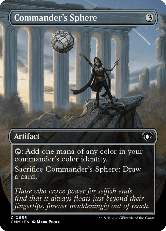 If you don't have a commander, Commander's Sphere's first ability produces no mana. — If you have two commanders, the ability adds one mana of any color in their combined color identities. — If your commander is a card that has no colors in its color identity, Commander's Sphere's first ability produces no mana. It doesn't produce {C}.