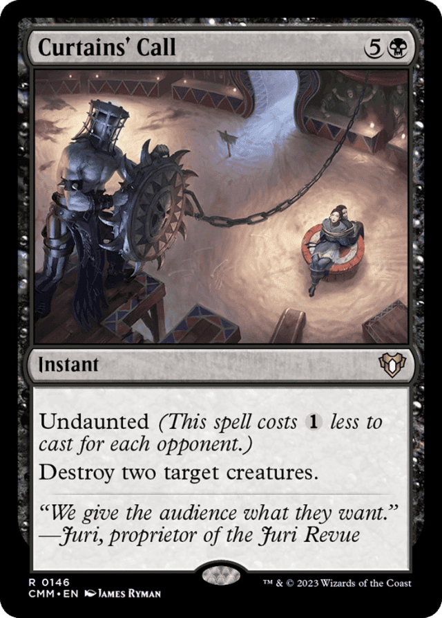 Causing an opponent to lose the game after you've announced that you're casting a spell with undaunted and determined its total cost won't cause you to have to pay more mana. — Effects that reduce what you pay to cast a spell don't affect its mana value. — You can't cast Curtains' Call without two creatures to target. If one becomes an illegal target after you've cast Curtains' Call, the other will still be destroyed.