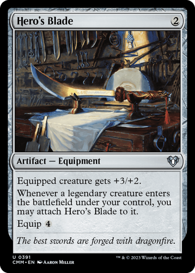 Equipped creature gets +3/+2. Whenever a legendary creature you control enters, you may attach this Equipment to it. Equip {4} ({4}: Attach to target creature you control. Equip only as a sorcery.)