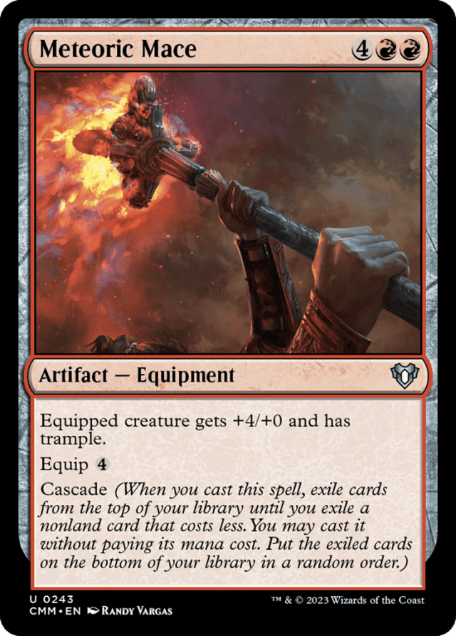 Equipped creature gets +4/+0 and has trample. Equip {4} Cascade (When you cast this spell, exile cards from the top of your library until you exile a nonland card that costs less. You may cast it without paying its mana cost. Put the exiled cards on the bottom in a random order.)