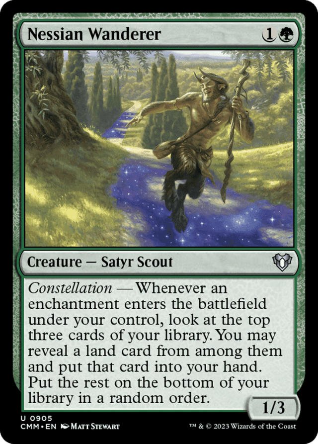 Constellation — Whenever an enchantment you control enters, look at the top three cards of your library. You may reveal a land card from among them and put that card into your hand. Put the rest on the bottom of your library in a random order.