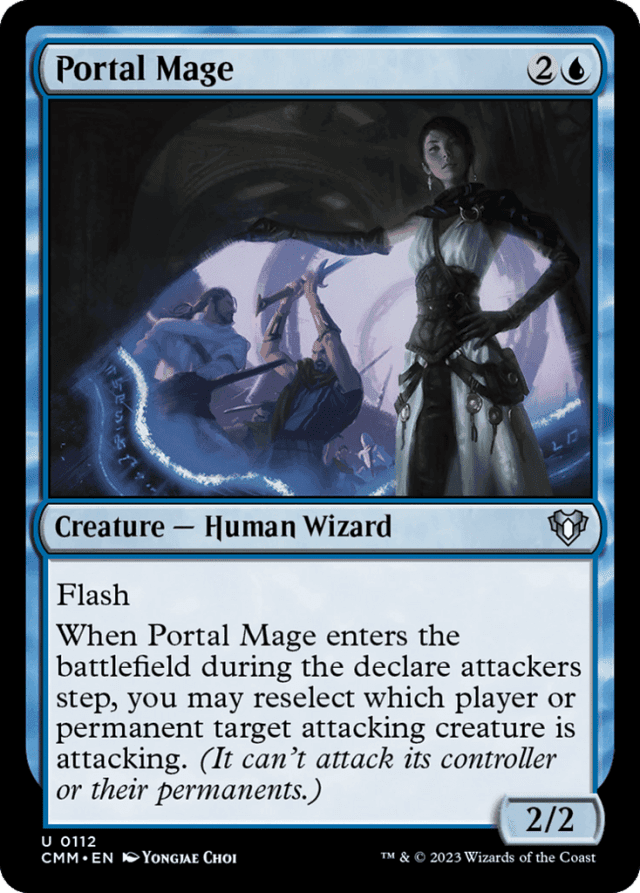 If an ability targets something controlled by the “defending player” of an attacking creature and the defending player for that creature changes before that ability resolves, the ability won’t resolve because its target has become illegal. — If you reselect which player or planeswalker an attacking creature is attacking, that creature is still considered to have attacked the player or planeswalker as declared, but it is now attacking the new player or planeswalker. — Reselecting which player or planeswalker a creature is attacking doesn’t cause “whenever this creature attacks” abilities to trigger. Notably, the Curses in this set (such as Curse of Vitality) won’t trigger while Portal Mage’s ability is resolving. — Reselecting which player or planeswalker a creature is attacking ignores all requirements, restrictions, and costs associated with attacking. — You may cast Portal Mage outside of a declare attackers step. If Portal Mage enters the battlefield outside of a declare attackers step, its ability simply doesn’t trigger.