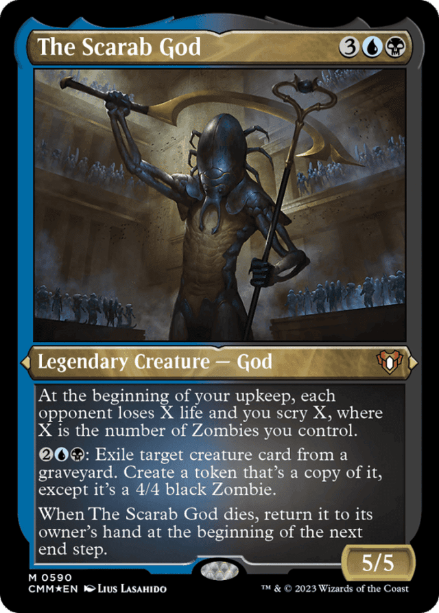 At the beginning of your upkeep, each opponent loses X life and you scry X, where X is the number of Zombies you control. {2}{U}{B}: Exile target creature card from a graveyard. Create a token that's a copy of it, except it's a 4/4 black Zombie. When The Scarab God dies, return it to its owner's hand at the beginning of the next end step.