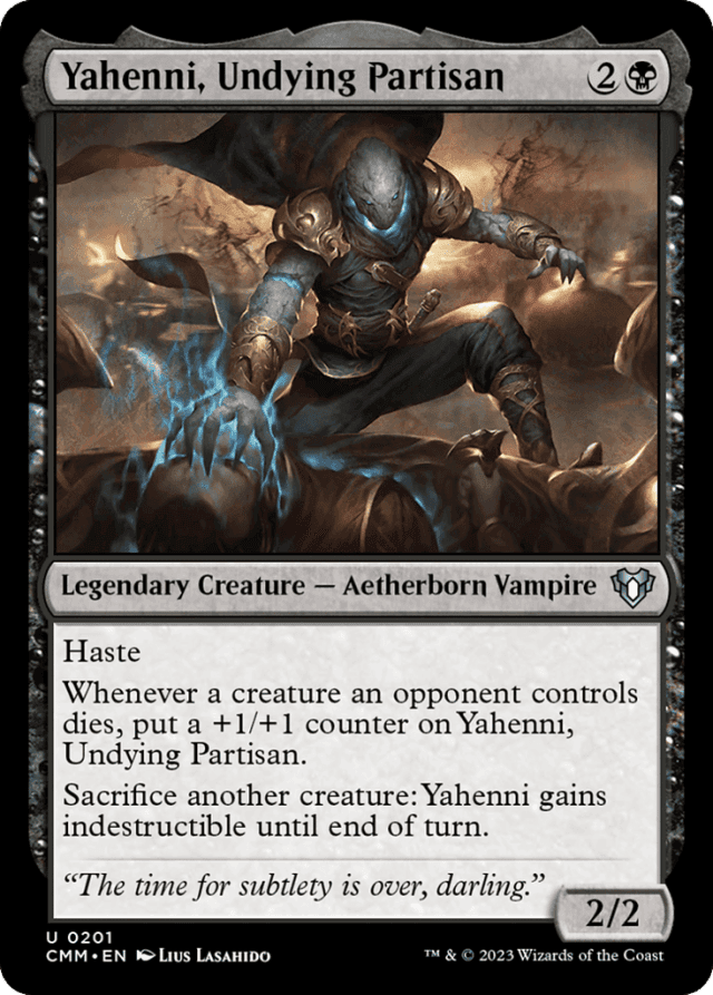 Haste Whenever a creature an opponent controls dies, put a +1/+1 counter on Yahenni. Sacrifice another creature: Yahenni gains indestructible until end of turn.