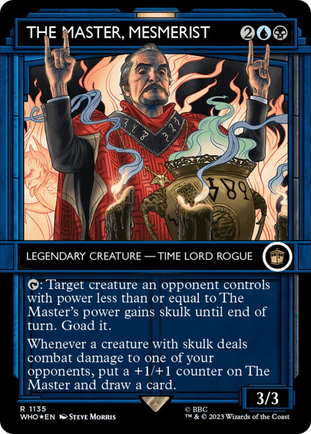 {T}: Target creature an opponent controls with power less than or equal to The Master's power gains skulk until end of turn. Goad it. (A creature with skulk can't be blocked by creatures with greater power.) Whenever a creature with skulk deals combat damage to one of your opponents, put a +1/+1 counter on The Master and draw a card.