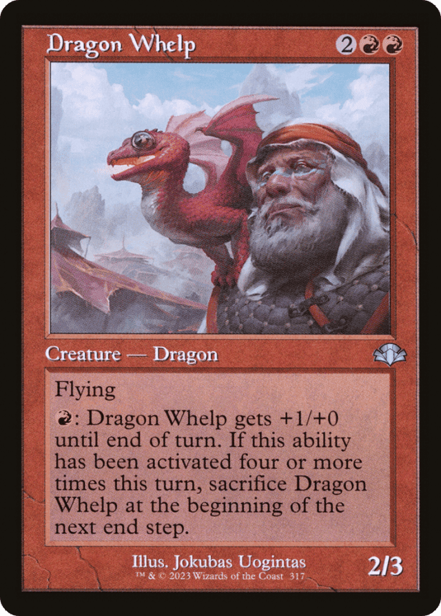 If the fourth (or more) time Dragon Whelp's ability is activated during the same turn happens to be during that turn's end step, the delayed triggered ability won't trigger until the beginning of the next turn's end step. You'll have to sacrifice Dragon Whelp at that time. — The first three times Dragon Whelp's ability is activated in a turn will do nothing other than give it +1/+0 until end of turn. Any subsequent activations will also cause its delayed triggered ability to trigger. That means if you activate Dragon Whelp's ability five times, for example, two different delayed triggered abilities will trigger at the beginning of the next end step and cause you to sacrifice Dragon Whelp. — If the fourth (or subsequent) time Dragon Whelp's ability is activated during the same turn is during that turn's end step, the delayed triggered ability won't trigger until the beginning of the next turn's end step. You'll have to sacrifice Dragon Whelp at that time. — There's no limit to the number of times you can activate Dragon Whelp's ability in a turn. However, the fourth activation in a turn and each subsequent activation will cause a delayed triggered ability that will force you to sacrifice Dragon Whelp at the beginning of the next end step.