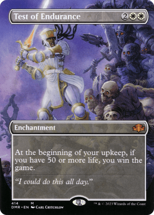 Test of Endurance’s ability will check your life total as your upkeep begins, before any player has the opportunity to take any actions. If you don’t have 50 or more life at that time, the ability won’t trigger at all. If the ability does trigger, it will check again as it tries to resolve. If your life total has fallen below 50 at that point, the ability won’t have any effect.