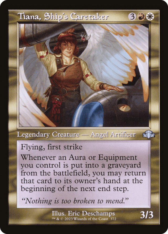 If an Aura or Equipment is put into your graveyard during an end step, you'll be able to return it during the next end step, not the current one. — If an Aura or Equipment leaves the graveyard after triggering Tiana's last ability, it won't be returned to its owner's hand as the delayed triggered ability resolves. — If an Aura or Equipment you control is put into a graveyard at the same time as Tiana is, most likely because an effect destroyed all nonland permanents, you'll be able to return it to its owner's hand at the beginning of the next end step. — If an Aura you control is put into a graveyard immediately after Tiana leaves the battlefield, most likely because Tiana left the battlefield but the Aura was put into the graveyard as a state-based action after it found itself not attached to anything, Tiana's last ability won't trigger. — Tiana's last ability triggers and creates a delayed triggered ability that will let you return the Aura or Equipment during the next end step. It will do so even if Tiana leaves the battlefield before the next end step.