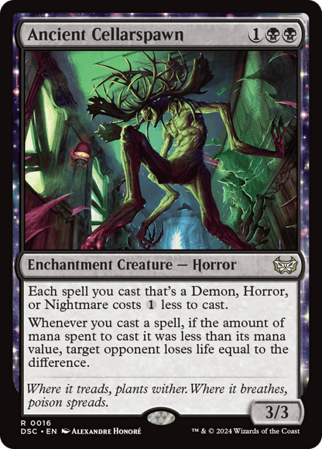 Each spell you cast that's a Demon, Horror, or Nightmare costs {1} less to cast. Whenever you cast a spell, if the amount of mana spent to cast it was less than its mana value, target opponent loses life equal to the difference.