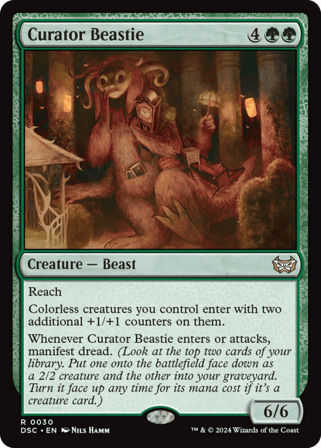 Reach Colorless creatures you control enter with two additional +1/+1 counters on them. Whenever this creature enters or attacks, manifest dread. (Look at the top two cards of your library. Put one onto the battlefield face down as a 2/2 creature and the other into your graveyard. Turn it face up any time for its mana cost if it's a creature card.)
