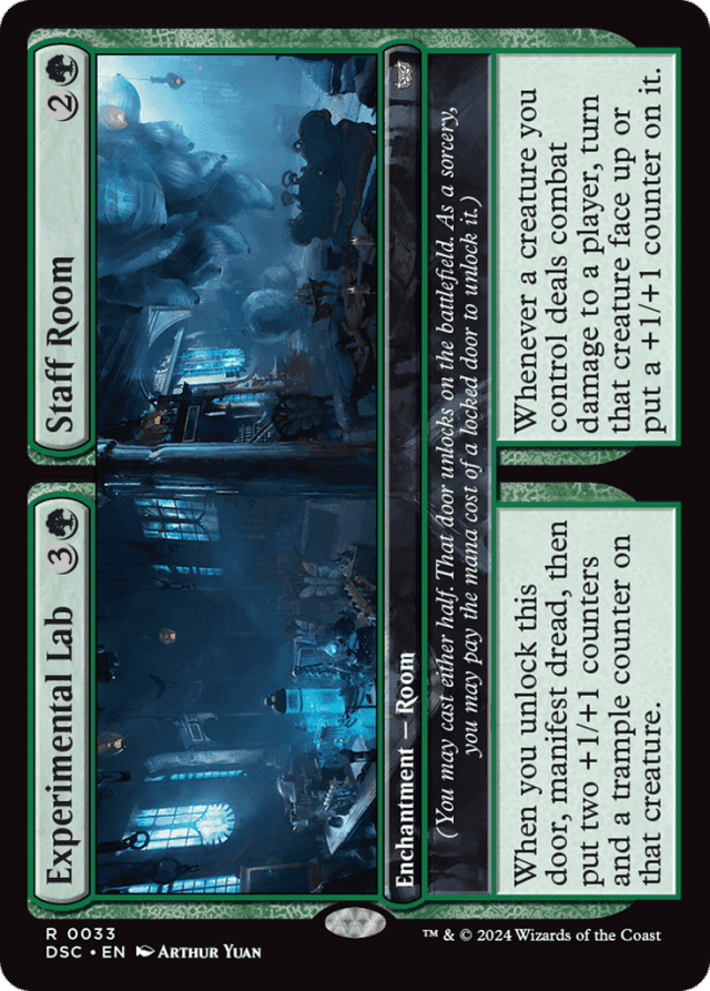 A permanent that turns face up or face down changes characteristics but is otherwise the same permanent. Spells and abilities that were targeting that permanent and Auras and Equipment that were attached to that permanent aren't affected unless the new characteristics of the object change the legality of those targets or attachments. — An ability that triggers "when you unlock this door" triggers when that door becomes unlocked. This can happen one of two ways: (1) the door becomes unlocked on the battlefield or (2) the door becomes unlocked as the Room enters the battlefield because you cast the corresponding half. In the latter case, since the door becoming unlocked is what causes the ability to trigger, effects that cause abilities that trigger when a permanent enters to trigger an additional time (such as that of Panharmonicon) won't apply. — An ability that triggers "whenever you fully unlock a Room" triggers when a door becomes unlocked and the other door of that Room is already unlocked, or when both doors of that Room become unlocked simultaneously. — Any time you have priority during a main phase of your turn and the stack is empty, you may pay the mana cost of a locked door (also called its "unlock cost"). That door becomes unlocked. This is a special action. It doesn't use the stack and can't be responded to. — Any time you have priority, you can turn a manifested permanent you control face up by revealing that it's a creature card (ignoring any copy effects or type-changing effects that might be applying to it) and paying its mana cost. This is a special action. It doesn't use the stack and can't be responded to. — At any time, you can look at a face-down spell or permanent you control. You can't look at face-down permanents or spells you don't control unless an effect instructs or allows you to do so. — Because face-down creatures don't have a name, they can't have the same name as any other creature, even another face-down creature. — Because the permanent is on the battlefield both before and after it's turned face up, turning a permanent face up doesn't cause any enters-the-battlefield abilities to trigger. — Each Room card has two names. If an effect instructs you to choose a card name, you may choose one of those names, but not both. — Each Room card is a single card. For example, if you discard a Room card, you've discarded one card, not two. If an effect counts the number of enchantment cards in your graveyard, Bottomless Pool // Locker Room counts once, not twice. — If a Room enters from any zone other than the stack, it will enter with both halves locked. — If a double-faced card is manifested, it will be put onto the battlefield face down. While face down, it can't transform. If the front face of the card is a creature card, you can turn it face up by paying its mana cost. If you do, its front face will be up. — If a face-down creature loses its abilities, it can't be turned face up with a disguise or morph ability because it will no longer have that ability (or the associated cost) once face up. — If a face-down spell leaves the stack and goes to any zone other than the battlefield (if it was countered, for example), you must reveal it. Similarly, if a face-down permanent leaves the battlefield, you must reveal it. You must also reveal all face-down spells and permanents you control if you leave the game or the game ends. — If a manifested creature would have disguise or morph if it were face up, you may also turn it face up by paying its disguise or morph cost, as appropriate. — If a spell or ability would create a copy of a Room spell on the stack, the copy retains the choice of which door was cast but also retains the full characteristics of the spell. The characteristics of the door that wasn't cast are still ignored while the copy is on the stack, and when the copy resolves, the token it becomes will enter with the appropriate door unlocked. — If an effect allows you to cast a spell with certain characteristics, consider only the characteristics of the door you're casting. For example, if an effect allows you to cast a permanent spell with mana value 3 or less from among cards in your graveyard, you could cast Bottomless Pool this way, but not Locker Room. — If neither door of a Room is unlocked, it's a Room enchantment with no name and no abilities. — If something tries to turn a face-down instant or sorcery card on the battlefield face up, reveal that card to show all players it's an instant or sorcery card. The permanent remains on the battlefield face down. Abilities that trigger when a permanent turns face up won't trigger, because even though you revealed the card, it never turned face up. — If your library contains only one card when you manifest dread, you'll look at that card and put it onto the battlefield face down. You won't have the option to put it into your graveyard instead. If your library contains no cards when you manifest dread, you won't do anything. — Room cards have two card faces with a shared type line on a single card. The characteristics of the door you didn't cast are ignored while the spell is on the stack. — Some abilities allow you to lock a door of a Room you control. You can't choose to lock a door that's already locked with such an ability. If such an ability requires a target, you can target a Room even if both of its doors are locked, but the ability won't do anything when it resolves. — Some abilities allow you to unlock a door of a Room you control. You can't choose to unlock a door that's already unlocked with such an ability. If such an ability requires a target, you can target a Room even if both of its doors are unlocked, but the ability won't do anything when it resolves. — Some cards in the Duskmourn release have abilities that trigger "whenever you manifest dread." In circumstances where you are instructed to manifest dread but can't perform some or all of the steps of 