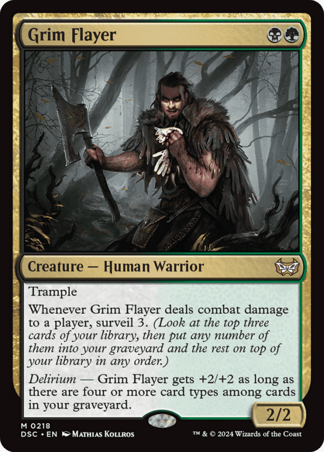 Trample Whenever this creature deals combat damage to a player, surveil 3. (Look at the top three cards of your library, then put any number of them into your graveyard and the rest on top of your library in any order.) Delirium — This creature gets +2/+2 as long as there are four or more card types among cards in your graveyard.
