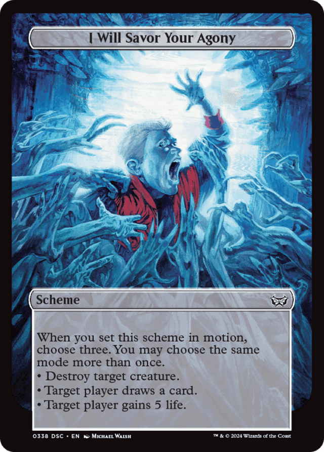 When you set this scheme in motion, choose three. You may choose the same mode more than once. • Destroy target creature. • Target player draws a card. • Target player gains 5 life.