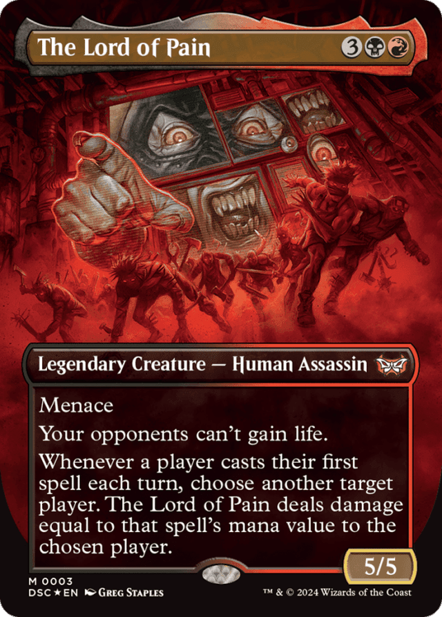 Menace Your opponents can't gain life. Whenever a player casts their first spell each turn, choose another target player. The Lord of Pain deals damage equal to that spell's mana value to the chosen player.