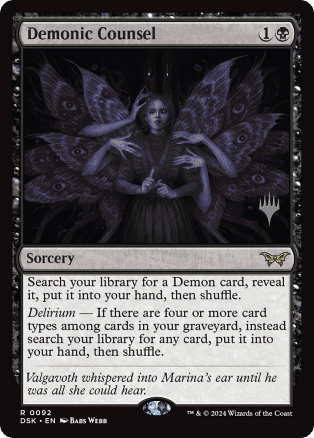 Search your library for a Demon card, reveal it, put it into your hand, then shuffle. Delirium — If there are four or more card types among cards in your graveyard, instead search your library for any card, put it into your hand, then shuffle.