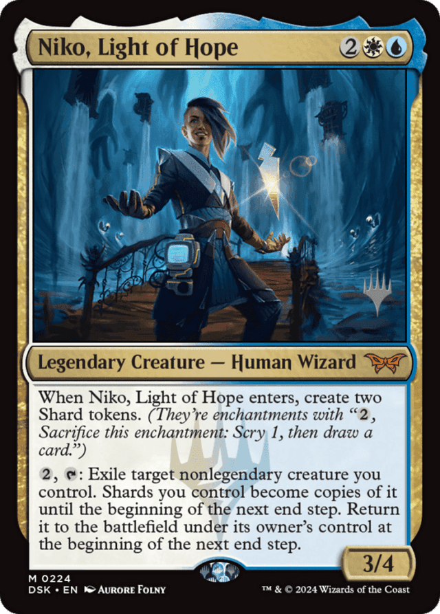 When Niko enters, create two Shard tokens. (They're enchantments with "{2}, Sacrifice this token: Scry 1, then draw a card.") {2}, {T}: Exile target nonlegendary creature you control. Shards you control become copies of it until the next end step. Return it to the battlefield under its owner's control at the beginning of the next end step.