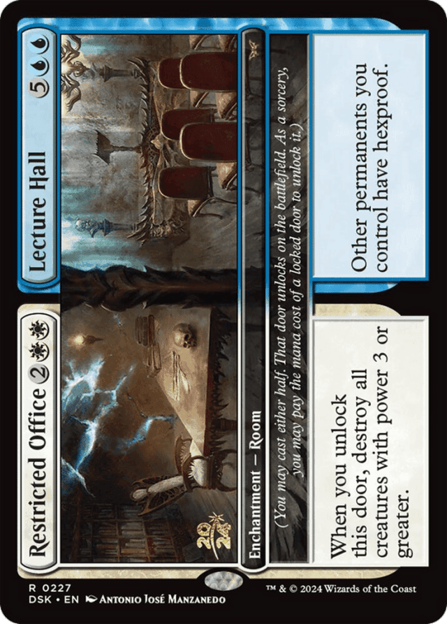 An ability that triggers "when you unlock this door" triggers when that door becomes unlocked. This can happen one of two ways: (1) the door becomes unlocked on the battlefield or (2) the door becomes unlocked as the Room enters the battlefield because you cast the corresponding half. In the latter case, since the door becoming unlocked is what causes the ability to trigger, effects that cause abilities that trigger when a permanent enters to trigger an additional time (such as that of Panharmonicon) won't apply. — An ability that triggers "whenever you fully unlock a Room" triggers when a door becomes unlocked and the other door of that Room is already unlocked, or when both doors of that Room become unlocked simultaneously. — Any time you have priority during a main phase of your turn and the stack is empty, you may pay the mana cost of a locked door (also called its "unlock cost"). That door becomes unlocked. This is a special action. It doesn't use the stack and can't be responded to. — Each Room card has two names. If an effect instructs you to choose a card name, you may choose one of those names, but not both. — Each Room card is a single card. For example, if you discard a Room card, you've discarded one card, not two. If an effect counts the number of enchantment cards in your graveyard, Bottomless Pool // Locker Room counts once, not twice. — If a Room enters from any zone other than the stack, it will enter with both halves locked. — If a spell or ability would create a copy of a Room spell on the stack, the copy retains the choice of which door was cast but also retains the full characteristics of the spell. The characteristics of the door that wasn't cast are still ignored while the copy is on the stack, and when the copy resolves, the token it becomes will enter with the appropriate door unlocked. — If an effect allows you to cast a spell with certain characteristics, consider only the characteristics of the door you're casting. For example, if an effect allows you to cast a permanent spell with mana value 3 or less from among cards in your graveyard, you could cast Bottomless Pool this way, but not Locker Room. — If neither door of a Room is unlocked, it's a Room enchantment with no name and no abilities. — Room cards have two card faces with a shared type line on a single card. The characteristics of the door you didn't cast are ignored while the spell is on the stack. — Some abilities allow you to lock a door of a Room you control. You can't choose to lock a door that's already locked with such an ability. If such an ability requires a target, you can target a Room even if both of its doors are locked, but the ability won't do anything when it resolves. — Some abilities allow you to unlock a door of a Room you control. You can't choose to unlock a door that's already unlocked with such an ability. If such an ability requires a target, you can target a Room even if both of its doors are unlocked, but the ability won't do anything when it resolves. — Some doors have abilities that trigger whenever you unlock that door and require one or more targets. You can unlock that door even if there would be insufficient legal targets for that triggered ability. The triggered ability won't go on the stack. — To cast a Room spell, choose a half (or "door") to cast. There's no way to cast both halves of a Room card. When the Room spell resolves, the corresponding door becomes unlocked as the Room enters. — While in any zone other than the stack or the battlefield, a Room card's characteristics are a combination of its two doors. For example, Bottomless Pool // Locker Room has a mana value of 6 while it's in your library. If an effect allows you to search your library for a card with mana value 4 or less, you can't find Bottomless Pool // Locker Room. — While on the battlefield, a Room's characteristics are a combination of the characteristics of its unlocked doors. For example, if Bottomless Pool // Locker Room is on the battlefield with both doors unlocked, its names are Bottomless Pool and Locker Room, its mana value is 6, it's a Room Enchantment, and it has the abilities in each door's text box.