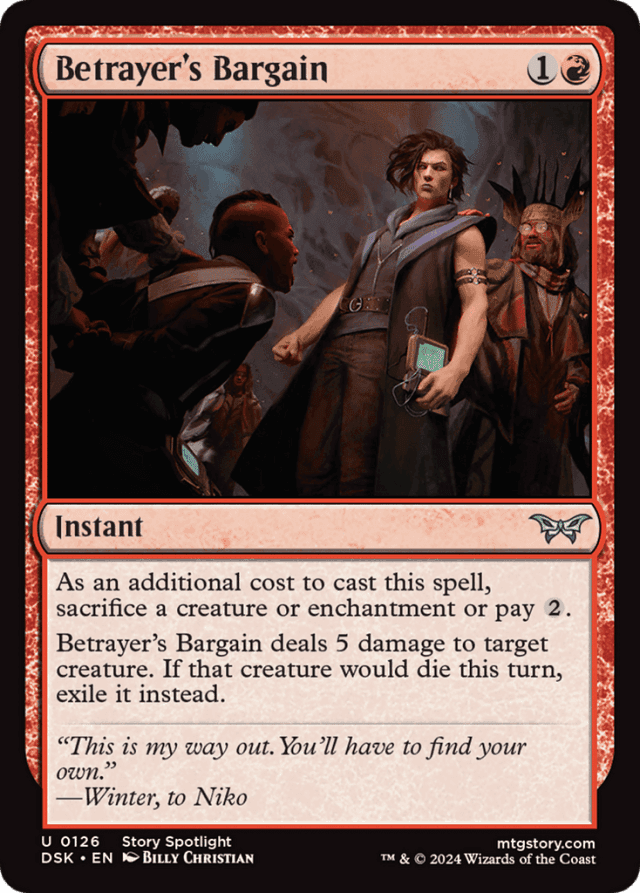 As an additional cost to cast this spell, sacrifice a creature or enchantment or pay {2}. Betrayer's Bargain deals 5 damage to target creature. If that creature would die this turn, exile it instead.