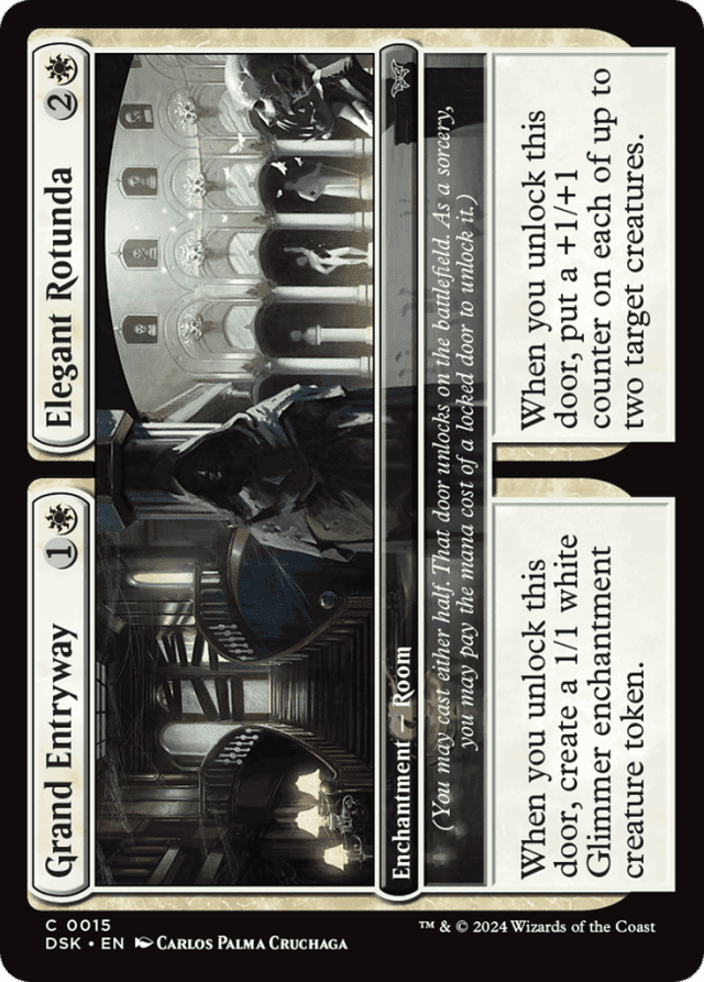 An ability that triggers "when you unlock this door" triggers when that door becomes unlocked. This can happen one of two ways: (1) the door becomes unlocked on the battlefield or (2) the door becomes unlocked as the Room enters the battlefield because you cast the corresponding half. In the latter case, since the door becoming unlocked is what causes the ability to trigger, effects that cause abilities that trigger when a permanent enters to trigger an additional time (such as that of Panharmonicon) won't apply. — An ability that triggers "whenever you fully unlock a Room" triggers when a door becomes unlocked and the other door of that Room is already unlocked, or when both doors of that Room become unlocked simultaneously. — Any time you have priority during a main phase of your turn and the stack is empty, you may pay the mana cost of a locked door (also called its "unlock cost"). That door becomes unlocked. This is a special action. It doesn't use the stack and can't be responded to. — Each Room card has two names. If an effect instructs you to choose a card name, you may choose one of those names, but not both. — Each Room card is a single card. For example, if you discard a Room card, you've discarded one card, not two. If an effect counts the number of enchantment cards in your graveyard, Bottomless Pool // Locker Room counts once, not twice. — If a Room enters from any zone other than the stack, it will enter with both halves locked. — If a spell or ability would create a copy of a Room spell on the stack, the copy retains the choice of which door was cast but also retains the full characteristics of the spell. The characteristics of the door that wasn't cast are still ignored while the copy is on the stack, and when the copy resolves, the token it becomes will enter with the appropriate door unlocked. — If an effect allows you to cast a spell with certain characteristics, consider only the characteristics of the door you're casting. For example, if an effect allows you to cast a permanent spell with mana value 3 or less from among cards in your graveyard, you could cast Bottomless Pool this way, but not Locker Room. — If neither door of a Room is unlocked, it's a Room enchantment with no name and no abilities. — Room cards have two card faces with a shared type line on a single card. The characteristics of the door you didn't cast are ignored while the spell is on the stack. — Some abilities allow you to lock a door of a Room you control. You can't choose to lock a door that's already locked with such an ability. If such an ability requires a target, you can target a Room even if both of its doors are locked, but the ability won't do anything when it resolves. — Some abilities allow you to unlock a door of a Room you control. You can't choose to unlock a door that's already unlocked with such an ability. If such an ability requires a target, you can target a Room even if both of its doors are unlocked, but the ability won't do anything when it resolves. — Some doors have abilities that trigger whenever you unlock that door and require one or more targets. You can unlock that door even if there would be insufficient legal targets for that triggered ability. The triggered ability won't go on the stack. — To cast a Room spell, choose a half (or "door") to cast. There's no way to cast both halves of a Room card. When the Room spell resolves, the corresponding door becomes unlocked as the Room enters. — While in any zone other than the stack or the battlefield, a Room card's characteristics are a combination of its two doors. For example, Bottomless Pool // Locker Room has a mana value of 6 while it's in your library. If an effect allows you to search your library for a card with mana value 4 or less, you can't find Bottomless Pool // Locker Room. — While on the battlefield, a Room's characteristics are a combination of the characteristics of its unlocked doors. For example, if Bottomless Pool // Locker Room is on the battlefield with both doors unlocked, its names are Bottomless Pool and Locker Room, its mana value is 6, it's a Room Enchantment, and it has the abilities in each door's text box.