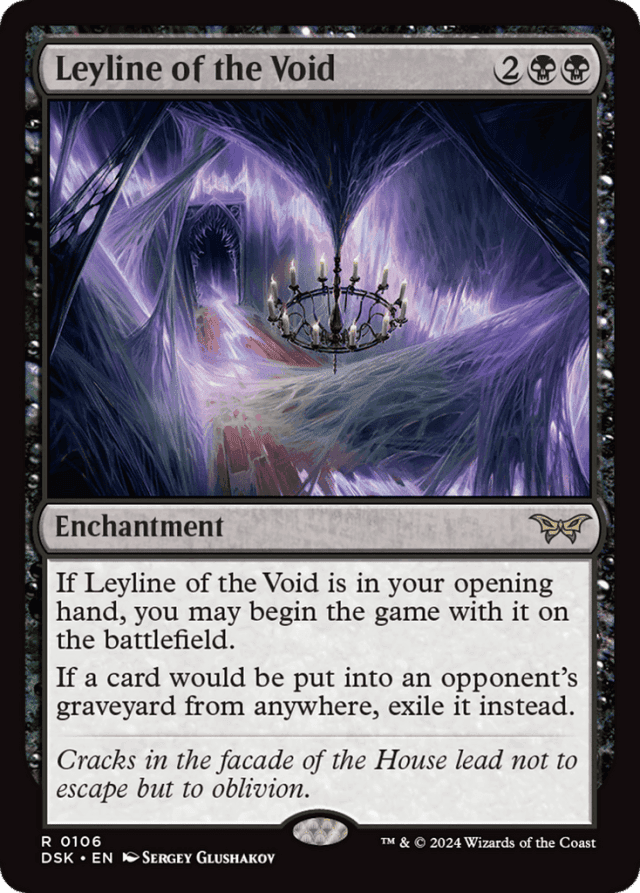A player's "opening hand" is the hand of cards the player has after all players have taken mulligans. If players have any cards in hand that allow actions to be taken with them from a player's opening hand, the starting player takes all such actions first in any order, followed by each other player in turn order. Then the first turn begins. — If your opponent discards a card while you control Leyline of the Void, abilities that check whether a card is discarded (such as Hollow One, or a madness ability of the discarded card) still work, even though that card never reaches that player's graveyard. In addition, spells or abilities that check the characteristics of the discarded card can find that card in exile. — Tokens can still die while Leyline of the Void is on the battlefield. — While Leyline of the Void is on the battlefield, nontoken creatures your opponents control won't die. They'll be exiled instead. Abilities that would trigger when those creatures die won't trigger.