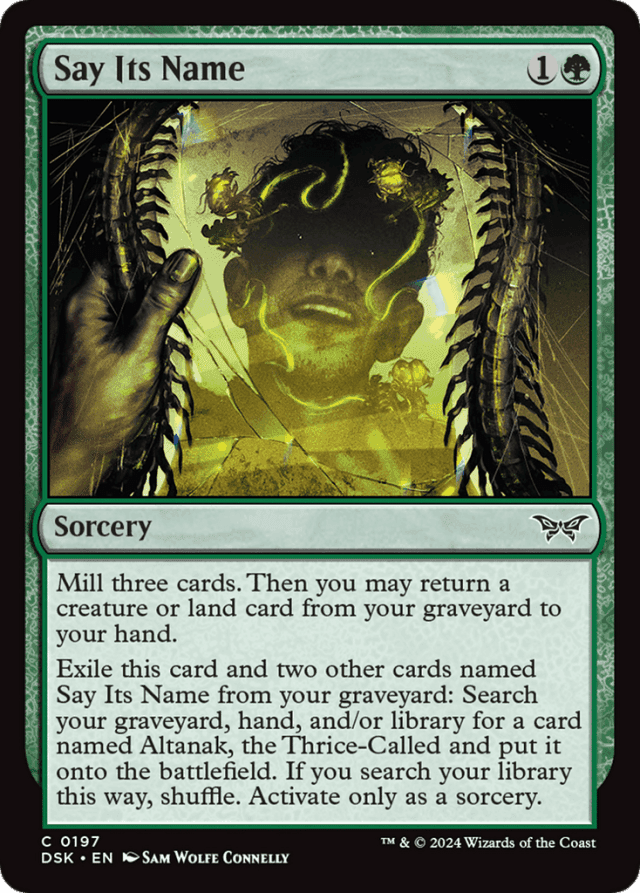 Mill three cards. Then you may return a creature or land card from your graveyard to your hand. Exile this card and two other cards named Say Its Name from your graveyard: Search your graveyard, hand, and/or library for a card named Altanak, the Thrice-Called and put it onto the battlefield. If you search your library this way, shuffle. Activate only as a sorcery.