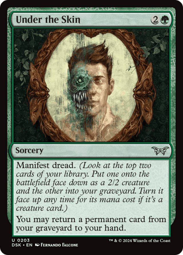 A permanent that turns face up or face down changes characteristics but is otherwise the same permanent. Spells and abilities that were targeting that permanent and Auras and Equipment that were attached to that permanent aren't affected unless the new characteristics of the object change the legality of those targets or attachments. — Any time you have priority, you can turn a manifested permanent you control face up by revealing that it's a creature card (ignoring any copy effects or type-changing effects that might be applying to it) and paying its mana cost. This is a special action. It doesn't use the stack and can't be responded to. — At any time, you can look at a face-down spell or permanent you control. You can't look at face-down permanents or spells you don't control unless an effect instructs or allows you to do so. — Because face-down creatures don't have a name, they can't have the same name as any other creature, even another face-down creature. — Because the permanent is on the battlefield both before and after it's turned face up, turning a permanent face up doesn't cause any enters-the-battlefield abilities to trigger. — If a double-faced card is manifested, it will be put onto the battlefield face down. While face down, it can't transform. If the front face of the card is a creature card, you can turn it face up by paying its mana cost. If you do, its front face will be up. — If a face-down creature loses its abilities, it can't be turned face up with a disguise or morph ability because it will no longer have that ability (or the associated cost) once face up. — If a face-down spell leaves the stack and goes to any zone other than the battlefield (if it was countered, for example), you must reveal it. Similarly, if a face-down permanent leaves the battlefield, you must reveal it. You must also reveal all face-down spells and permanents you control if you leave the game or the game ends. — If a manifested creature would have disguise or morph if it were face up, you may also turn it face up by paying its disguise or morph cost, as appropriate. — If something tries to turn a face-down instant or sorcery card on the battlefield face up, reveal that card to show all players it's an instant or sorcery card. The permanent remains on the battlefield face down. Abilities that trigger when a permanent turns face up won't trigger, because even though you revealed the card, it never turned face up. — If your library contains only one card when you manifest dread, you'll look at that card and put it onto the battlefield face down. You won't have the option to put it into your graveyard instead. If your library contains no cards when you manifest dread, you won't do anything. — Some cards in the Duskmourn release have abilities that trigger "whenever you manifest dread." In circumstances where you are instructed to manifest dread but can't perform some or all of the steps of manifesting dread (probably because your library has one or fewer cards in it), these abilities will still trigger. — The permanent card can be one you milled while manifesting dread, but it doesn't have to be. — To manifest dread, look at the top two cards of your library. Manifest one (by putting it onto the battlefield face down) and put the other into your graveyard. The card you put onto the battlefield becomes a 2/2 face-down creature with no name, mana cost, creature types, or abilities. It's colorless and has a mana value of 0. Other effects that apply to the permanent can still grant it any characteristics it doesn't have or change the characteristics it does have. — Turning a permanent face up or face down doesn't change whether that permanent is tapped or untapped. — Unlike a face-down creature that was cast using a disguise or morph ability, a manifested creature may still be turned face up after it loses its abilities if it's a creature card. — You must ensure that your face-down spells and permanents can be easily differentiated from each other. You're not allowed to mix up the cards that represent them on the battlefield to confuse other players. The order in which they entered should remain clear, as well as what ability caused them to be face down. (This includes manifest, disguise, cloak, morph, and a few older effects that turn cards face down.) Common methods for doing this include using markers or dice, or simply placing them in order on the battlefield.