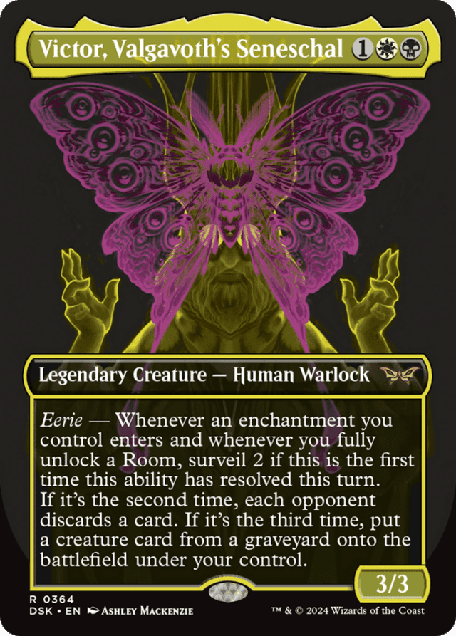 An ability that triggers "whenever you fully unlock a Room" triggers when a door becomes unlocked and the other door of that Room is already unlocked, or when both doors of that Room become unlocked simultaneously. — If a permanent with an eerie ability enters at the same time as one or more enchantments, its ability will trigger for each of those enchantments. — Victor's ability has no effect beyond the third time it resolves in a turn.