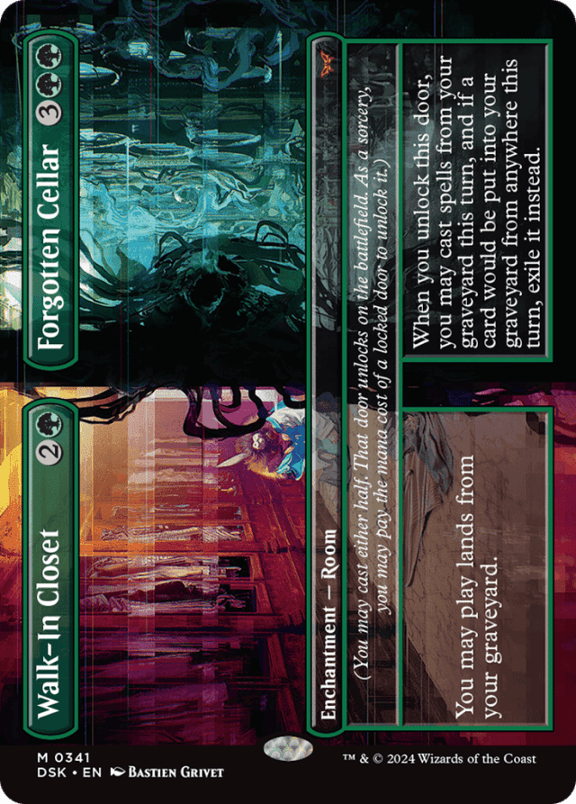An ability that triggers "when you unlock this door" triggers when that door becomes unlocked. This can happen one of two ways: (1) the door becomes unlocked on the battlefield or (2) the door becomes unlocked as the Room enters the battlefield because you cast the corresponding half. In the latter case, since the door becoming unlocked is what causes the ability to trigger, effects that cause abilities that trigger when a permanent enters to trigger an additional time (such as that of Panharmonicon) won't apply. — An ability that triggers "whenever you fully unlock a Room" triggers when a door becomes unlocked and the other door of that Room is already unlocked, or when both doors of that Room become unlocked simultaneously. — Any time you have priority during a main phase of your turn and the stack is empty, you may pay the mana cost of a locked door (also called its "unlock cost"). That door becomes unlocked. This is a special action. It doesn't use the stack and can't be responded to. — Cards that would be put into your graveyard on the turn Forgotten Cellar's ability resolves are exiled even if you didn't play them this turn. — Each Room card has two names. If an effect instructs you to choose a card name, you may choose one of those names, but not both. — Each Room card is a single card. For example, if you discard a Room card, you've discarded one card, not two. If an effect counts the number of enchantment cards in your graveyard, Bottomless Pool // Locker Room counts once, not twice. — Forgotten Cellar's ability won't stop tokens from going to your graveyard as normal (and ceasing to exist shortly thereafter, also as normal). — If a Room enters from any zone other than the stack, it will enter with both halves locked. — If a spell or ability would create a copy of a Room spell on the stack, the copy retains the choice of which door was cast but also retains the full characteristics of the spell. The characteristics of the door that wasn't cast are still ignored while the copy is on the stack, and when the copy resolves, the token it becomes will enter with the appropriate door unlocked. — If an effect allows you to cast a spell with certain characteristics, consider only the characteristics of the door you're casting. For example, if an effect allows you to cast a permanent spell with mana value 3 or less from among cards in your graveyard, you could cast Bottomless Pool this way, but not Locker Room. — If neither door of a Room is unlocked, it's a Room enchantment with no name and no abilities. — Room cards have two card faces with a shared type line on a single card. The characteristics of the door you didn't cast are ignored while the spell is on the stack. — Some abilities allow you to lock a door of a Room you control. You can't choose to lock a door that's already locked with such an ability. If such an ability requires a target, you can target a Room even if both of its doors are locked, but the ability won't do anything when it resolves. — Some abilities allow you to unlock a door of a Room you control. You can't choose to unlock a door that's already unlocked with such an ability. If such an ability requires a target, you can target a Room even if both of its doors are unlocked, but the ability won't do anything when it resolves. — Some doors have abilities that trigger whenever you unlock that door and require one or more targets. You can unlock that door even if there would be insufficient legal targets for that triggered ability. The triggered ability won't go on the stack. — To cast a Room spell, choose a half (or "door") to cast. There's no way to cast both halves of a Room card. When the Room spell resolves, the corresponding door becomes unlocked as the Room enters. — Walk-In Closet's ability doesn't allow you to activate abilities (such as cycling) of land cards in your graveyard. — Walk-In Closet's ability doesn't change the times when you can play those land cards. You can still play only one land per turn, and only during your main phase when you have priority and the stack is empty. — While in any zone other than the stack or the battlefield, a Room card's characteristics are a combination of its two doors. For example, Bottomless Pool // Locker Room has a mana value of 6 while it's in your library. If an effect allows you to search your library for a card with mana value 4 or less, you can't find Bottomless Pool // Locker Room. — While on the battlefield, a Room's characteristics are a combination of the characteristics of its unlocked doors. For example, if Bottomless Pool // Locker Room is on the battlefield with both doors unlocked, its names are Bottomless Pool and Locker Room, its mana value is 6, it's a Room Enchantment, and it has the abilities in each door's text box. — You pay all costs and follow all timing rules for spells cast from your graveyard with the permission granted by Forgotten Cellar's ability. You may pay alternative costs, such as impending costs, rather than the spell's mana cost. You may pay optional additional costs, such as kicker, and if there are any mandatory additional costs, those must be paid to cast the spell.